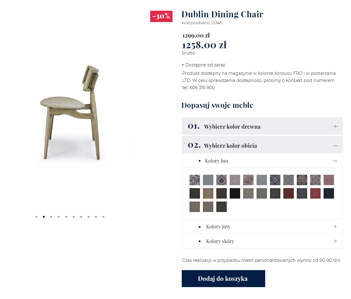 Projekt konfiguratora dla sklepu internetowego Woodrich to narzędzie umożliwiające użytkownikom personalizację designerskich mebli według własnych potrzeb i gustu. Klienci mogą wybierać spośród różnych opcji materiałów, kolorów, rozmiarów oraz dodatkowych funkcji, które dopasowują produkt do ich wnętrza. Intuicyjny interfejs pozwala na łatwe wprowadzanie zmian i natychmiastowe podglądanie efektów. Konfigurator usprawnia proces zakupowy, zapewniając klientom pełną kontrolę nad wyglądem i specyfikacją zamawianych produktów.