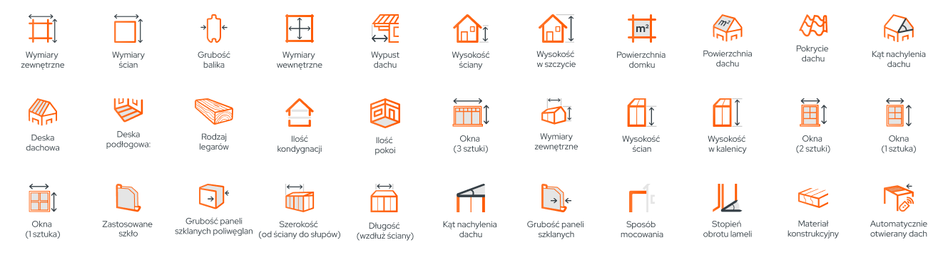 Do sklepu internetowego stworzyłam zestaw ikonek wektorowych opisujący cechy produktów. Domki drewniane, pergole, szklarnie i ogrody zimowe mają bardzo specyficzne i różniące się od siebie cechy. Oczywiście, dla lepszej czytelności i dla accessibility, każda z ikonek gdy jest prezentowana na stronie jest podpisana.
