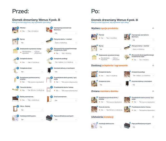 Kolejnym rozwiązaniem do zaprojektowania był konfigurator domku drewnianego. Tego rodzaju produkt wyróżnia się dużą ilością bardzo detalicznych opcji, więc zasugerowałam zgrupowanie ich w odpowiednie foldery (maksymalnie liczba Millera), takie jak: „ogólne, ocieplenie i ogrzewanie, rozmiar, wykończenie, instalacje”. Nie tylko zdjęcia zamiast ikonek ale i tooltipy obok nich pomagają dokładnie opisać konkretne opcje konfiguratora. (Heuresyka Nielsena: Pokaż, zamiast zmuszać do pamiętania).