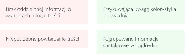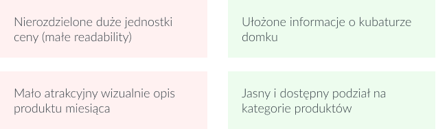 Dużym wyzwaniem było pokazanie wielu informacji (wymiary domku, wysokość, powierzchnia, kąt dachu) na jednym kafelku. Przy pomocy odpowiednio dobranej typografii osiągnęłam wizualną separację pomiędzy szczegółami a tytułem i ceną domku. Przeanalizowałam heatmapy stron produktów, żeby dowiedzieć się, które z informacji warto wyciągnąć.
